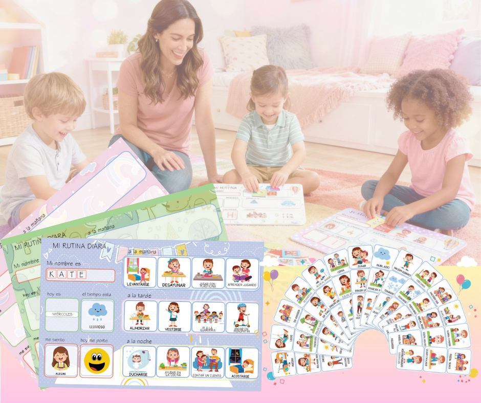 🧩 “Mi Rutina Diaria”: sistema con +80 tarjetas ilustradas para organizar cada momento del día. Rutinas específicas para mañana, tarde y noche (listas para usar sin repetir mil veces).